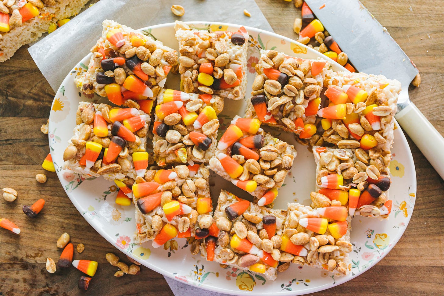 Listen, the only correct way to eat candy corn is by the handful with salted peanuts. It’s the sweet-salty combo that transforms the whole situation into a makeshift nougat candy bar. Unfortunately, the only way to stop eating candy corn is to make yourself absolutely sick on the stuff. I truly wish there were another way. Thankfully, candy corn is strictly an October affair, so we go hard and then we get out. While we’re going hard, may I humbly suggest these Salted Peanut and Candy Corn Krispie Treats to really turn up the volume on the season?