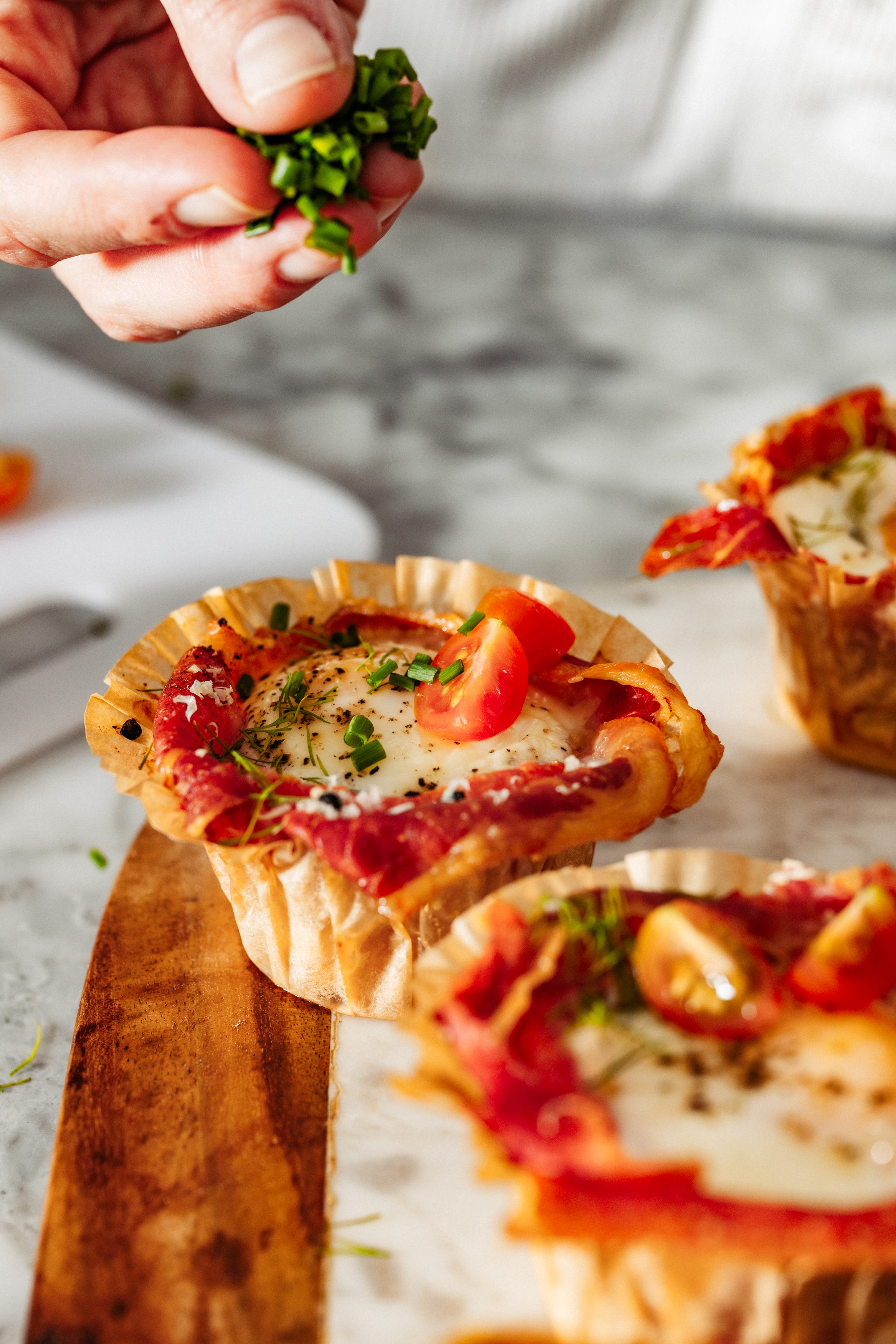 These little egg cups are my kind of Easter cooking- fancy without a fuss. The prosciutto crisps into a salty, savory shell while the tomato and Parmesan melt into the eggs just enough to feel special. And, if you don’t want sliced tomatoes in these cups, sub any leftover roasted veggie you might have in the fridge. It will all be delicious!