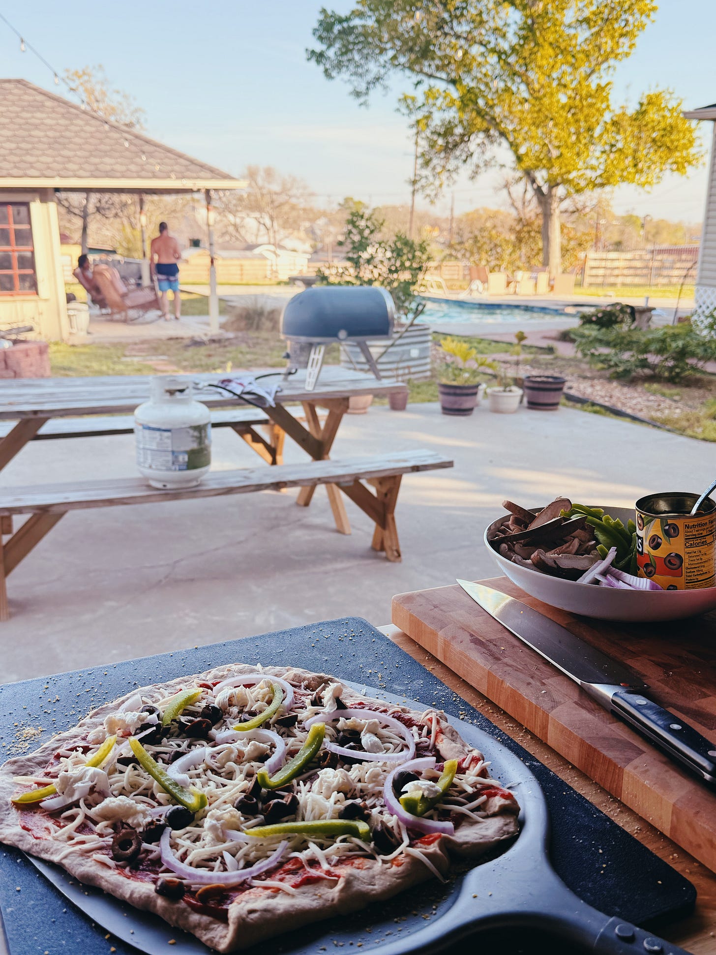 At home I made pizza in the little outdoor pizza oven using this crust recipe, Barton Springs Mill flour, and a truly heroic amount of vegetables and thick-cut pepperoni. It’s been one of those weekends that feels exactly like a weekend should: a little loose, a little indulgent, and full of people you’re happy to linger around the table with.