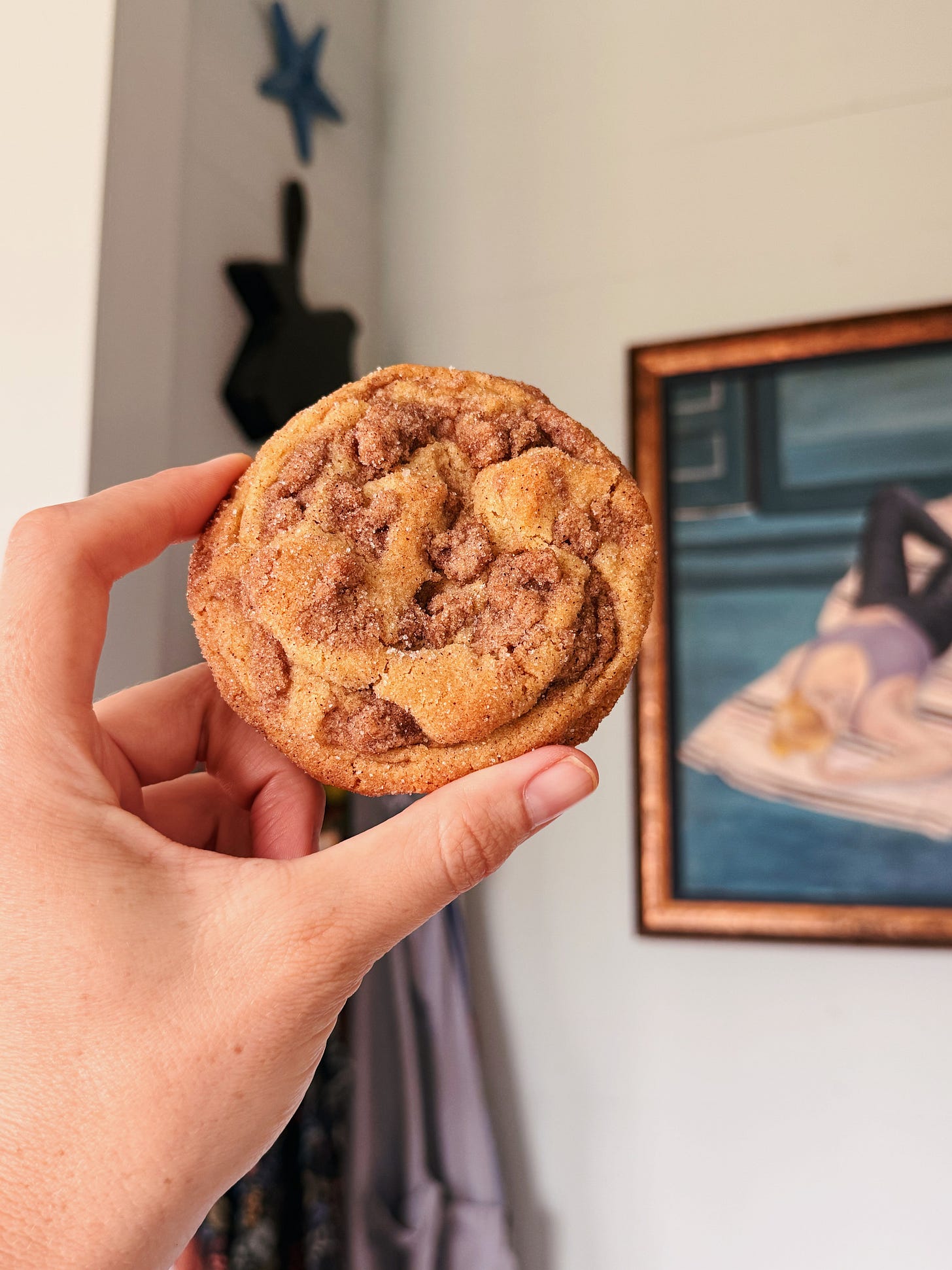 The cookie itself has that signature snickerdoodle tang thanks to cream of tartar and bakes up sturdy at the edges, soft and caramelized in the center, warm with cinnamon and spice.