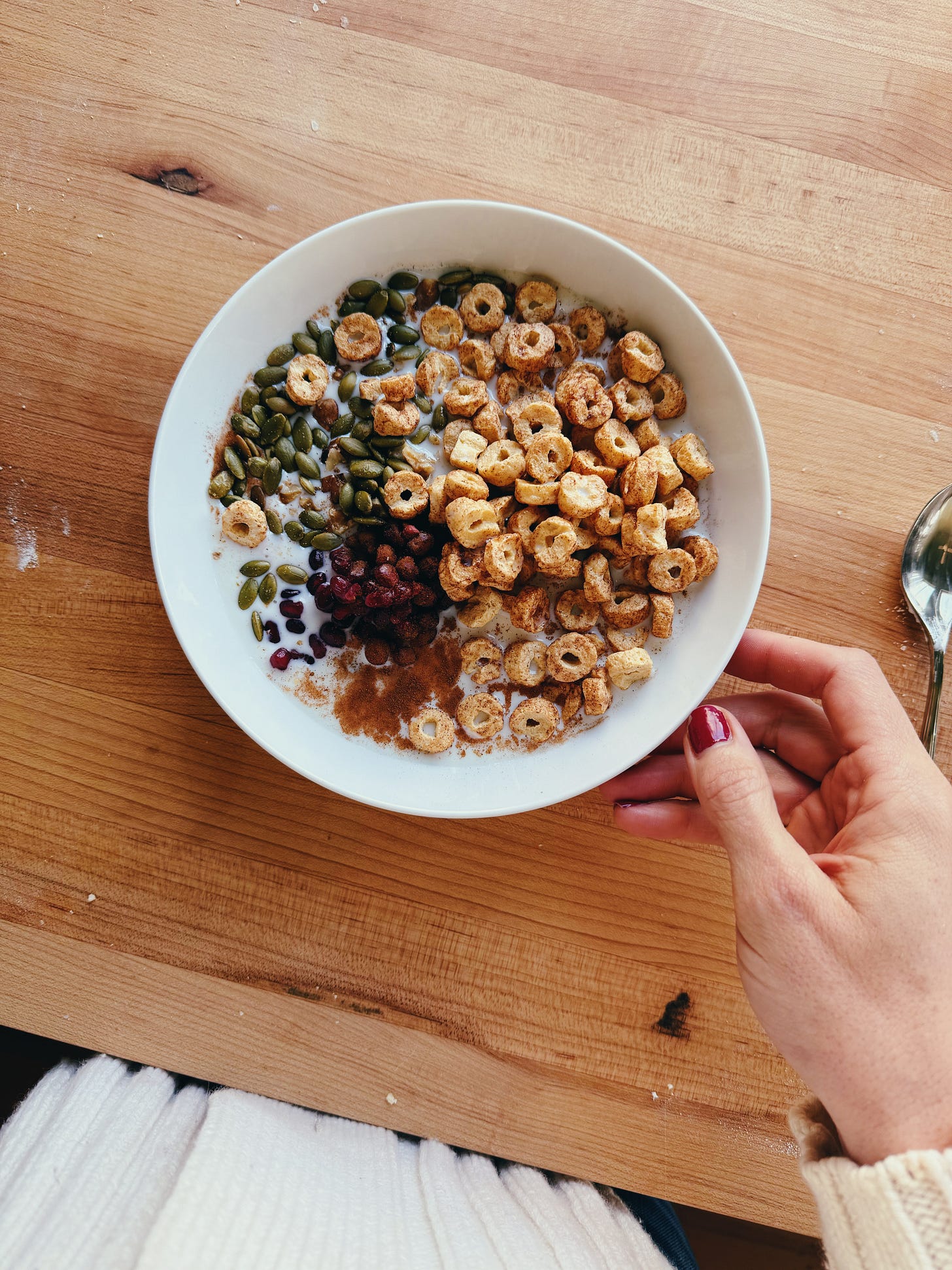 The thing about me is that I will chef even a bowl of cereal. Maybe sometimes I simply can’t leave well enough alone. But cereal and milk can be so much more than cereal and milk, you know? If we’re already up in the middle of the night, we might as well make the bowl work for us. Consider it habit stacking… but with snacks.