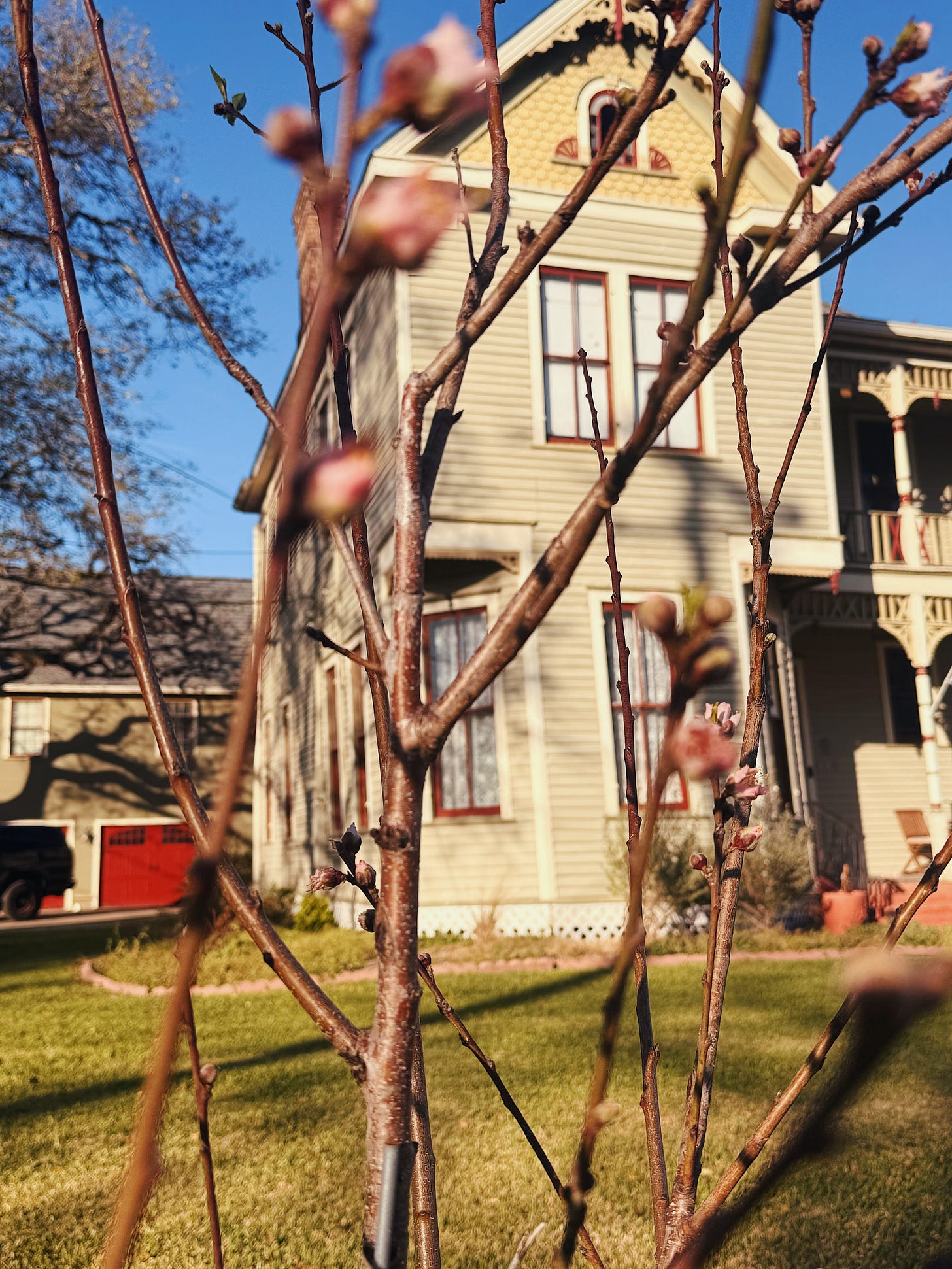 Two years ago I planted a Sam Houston peach tree in the front yard, inspired by my friend Timmy’s wildly generous peach trees back in New Orleans.