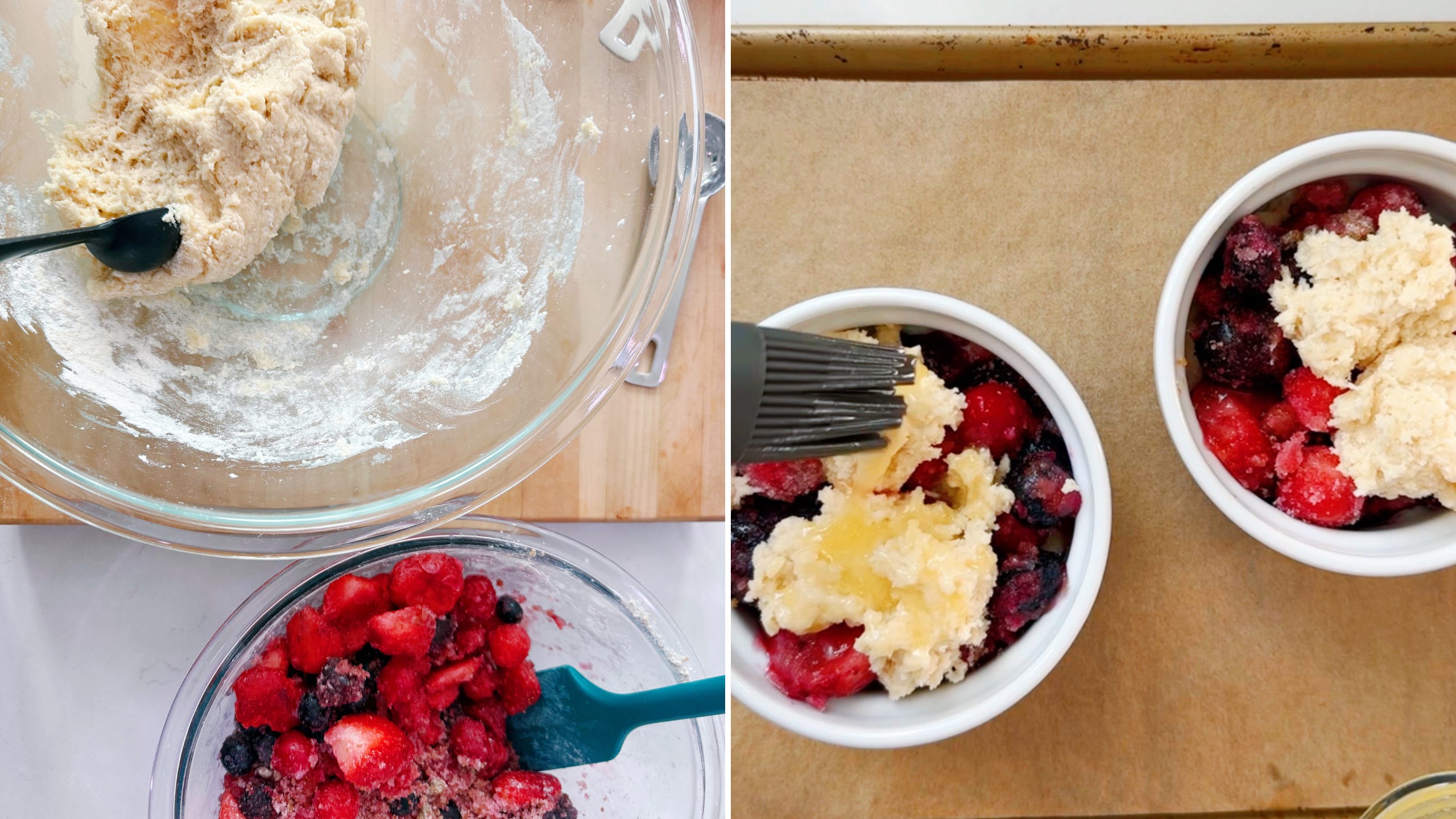 Remove from the oven and add a heaping 1/2 cup of berries evenly among ramekins. To the top add an additional 2 tablespoons of the dough. Do not cover the berries totally with the dough. Steam needs to escape. The dough will gradually cover the berries as it bakes.