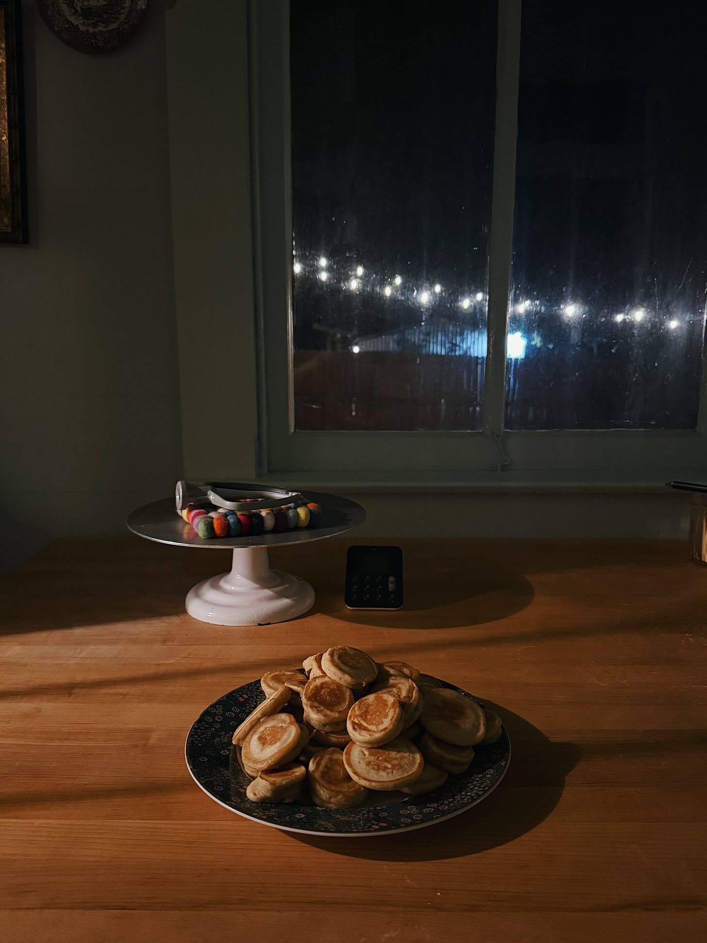 I was up, of course, listening for leaks (a reasonable precaution in a house this age) but mostly just feeling the house hold steady while the trees outside shed a few limbs that softly landed in the yard for morning cleanup. I couldn’t sleep for it - the noise, the wonder of it all - so I gave in and got up to make pancakes at 4 a.m. I flipped them one by one in butter and leftover bacon grease, snacked on a few with my pot of half-caff coffee, and tucked the rest in the oven for when Will and the dogs woke up.